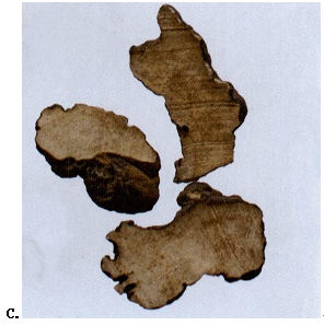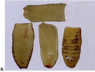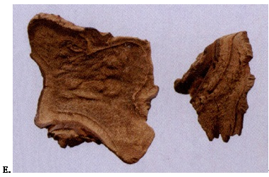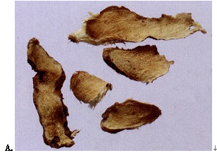 图D为当归,略呈圆柱形,下部有支根3~5条或更多,表面黄棕色至棕褐色,具纵皱纹及横长皮孔样突起。根头(归头),具环纹,上端圆钝,或具数个明显突出的根茎痕,有紫色或黄绿色的茎及叶鞘的残基;主根(归身)表面凹凸不平;支根(归尾),上粗下细,多扭曲,有少数须根痕。质柔韧,断面黄白色或淡黄棕色,皮部厚,有裂隙及多数棕色点状分泌腔,木部色较淡,形成层环黄棕色。有浓郁的香气,味甘、辛、微苦。