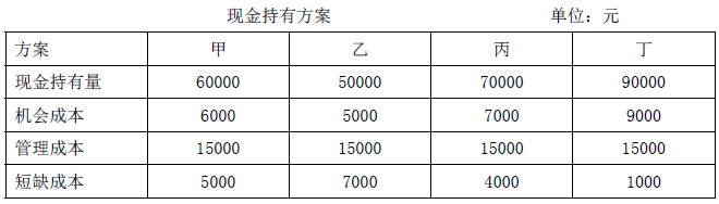 总成本=机会成本+管理成本+短缺成本,总成本最小的就是最佳现金持有量。甲:26000 元;乙:27000 元;丙:26000 元;丁:25000 元。