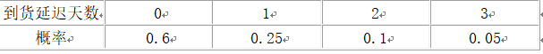 2、东方公司生产中使用甲零件,全年共需耗用3600件,购入单价为9.8元,从发出订单到货物到达需要10天时间,一次订货成本72元。外购零件时可能发生延迟交货,延迟的时间和概率如下: