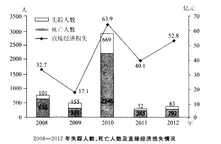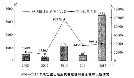 2008--2012年地质灾害造成的死亡人数和失踪人数相差最小的年份,特大型地质灾害防 治避免人员伤亡( )人。