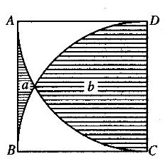 如下图所示,正方形ABCD的边长为5cm,AC、BD分别是以点D和点C 为圆心、5cm为半径作的圆弧。问阴影部分a的面积比阴影部分b小多少? (π取3.14)( )