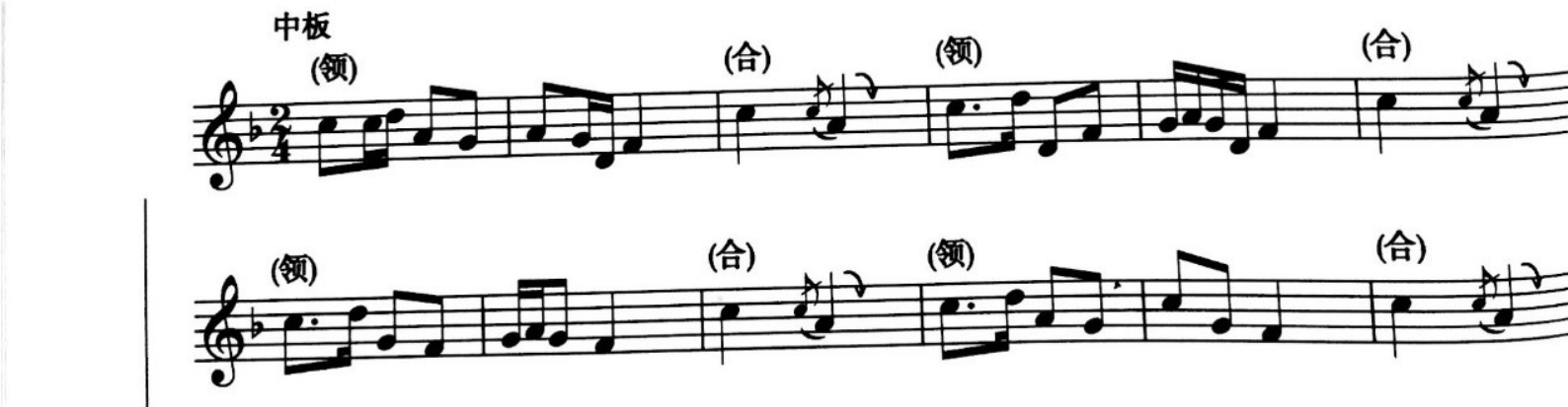 下谱例中的歌唱形式是劳动号子的哪一种独特的歌唱方式?( ) A.齐唱B.合唱C.一领众和D.轮唱