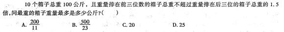 本题属于构造法类题目。通过分析可知,当第2至第10名箱子重量相等时,最重箱子重量最重。假设其余箱子的i量是X,那么最重的箱子童量为2. 5x,也就是说9x + 2. 5x = 100,2. 5x = 500/23。故选B。