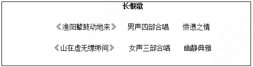 二、考题解析【教学过程】(一)导入新课1.多媒体导入:播放视频《霓裳羽衣曲》片段,并提问:同学们,你知道这是什么作品吗?(《霓裳羽衣曲》)2.教师总结:霓裳羽衣曲是唐朝大曲中的法曲精品,唐歌舞的集大成之作。相传为唐玄宗李隆基所作,由他宠爱的贵妃杨玉环作舞表演。唐玄宗和杨贵妃轰轰烈烈的爱情最终以悲剧收场,这段凄楚缠绵回旋婉转的故事一直被世人所传唱。古往今来,纪念他们的作品数不胜数,但最具影响力的无疑是清唱剧——《长恨歌》。今天,就让我们搭上时空的列车,去聆听这遗恨千年的爱情绝唱吧! 题目来源于考生回忆(二)新课讲授1.拓展知识,了解作品。(1)学生自由发言谈谈对清唱剧及长恨歌的了解。(2)教师评价总结:清唱剧是一种多乐章的声乐套曲,包含多种演唱形式,由管弦乐队伴奏。各乐章的歌词内容有机结合构成一个较为完整的故事情节,具有一定的戏剧特点。《长恨歌》由我国现代著名音乐家黄自所作,是中国现代音乐史上第一部清唱剧作品。内容取材于唐代著名诗人白居易的同名长诗,并选用其中的诗句作为各乐章的标题,借唐明皇不理朝政之事对国民党反动政府进行了有力的讽刺。这部大型声乐套曲共分十个乐章,黄自只完成了其中七个乐章的谱曲工作,而第四、七、九乐章则由林声翕于1972年补写。2.赏析《渔阳鼙鼓动地来》。(1)播放多媒体,聆听歌曲,提问:歌曲属于什么体裁?运用了哪种演唱形式?(进行曲;男声四部合唱)(2)再次聆听,提问:歌曲表现了什么内容?(边关告急,权臣造反,正处于政治动荡危机关头,统治者却依然处在歌舞升平的环境,展现出“只爱美人醇酒,不爱江山”的昏庸状态)追问:表达了什么情感?(士兵对统治者深深的愤懑之情)赏析《山在虚无缥缈间》。播放音乐,设置提问:歌曲的演唱形式是什么?风格又是怎样的 ?(女声三部合唱;幽静典雅。)再次聆听,提问:歌曲营造出一种怎样的意境?(勾画了“蓬莱仙境”那种虚幻神秘的意境。)识读乐谱,学唱两首歌曲。(1)进行简单的发声练习。(2)组织多种形式演唱。(三)拓展延伸组织合唱比赛,根据演唱形式分组,分别演唱两首歌曲。(四)小结作业(1)小结:师生共同总结。《长恨歌》表面是讲述唐玄宗和杨贵妃的爱情悲剧,实则借古讽今,表现了作者的爱国热忱,在当时具有一定的进步意义。它以独特的方式反映社会现实,向人们宣告,腐败的政治必然会导致民族的灾难,有力地配合了我党领导的抗日救亡运动,可以说,音乐是一种具有无形力量的强大武器。题目来源于考生回忆(2)作业:聆听其他乐章并搜集黄自的生平及贡献,下节课交流分享。【板书设计】