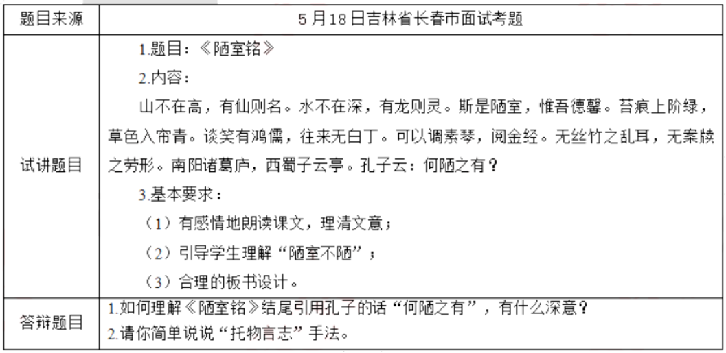 二、考题解析【教学过程】(一)导入新课曾经有一个文人因政治革新,得罪了当朝权贵宠臣,被贬为安徽和州通判。当地的知县是个趋炎附势的小人,他得知文人被贬而来,便多方刁难强迫他在半年内搬了三次家,最后住进了仅能容纳一桌一椅一床的陋室。如果是你们,你们会怎么办呢?这位文人他写了篇文章刻在自己门前的石碑上。今天我们一起来学习这篇立于房门之前的文章《陋室铭》。(二)整体感知1.反复吟诵全文,划出读不准的字音,读出节奏,教师指导。2.自由读课文,疏通文意,提出疑问,集体交流。(三)研读赏析1.细读课文,理清内容。学生有感情地朗读前三句,思考讨论:作者的目的是写陋室,为何要在开头引用有仙之山、有龙之水呢?(学生讨论并积极发言。)明确:作者的目的是写陋室,却用山水作比喻,这种方法叫比兴。开头以比喻起兴,以虚(山水)衬实(陋室主人),引出“斯是陋室”,而立意于“惟吾德馨”。这几句既是形象的比喻,又是事物的类比,表明“陋室”也具有“名”和“灵”的性质,即“陋室”不“陋”。“陋室”二字扣题,“德馨”一词统领全篇。朗读后六句进一步探究作者写作的文章内容:课文哪里能够说明陋室不陋呢?表达了作者什么样的品格?明确:①“苔痕上阶绿,草色入帘青”,写环境的清幽、雅致。——景。反映出室主人淡泊名利的志趣。这是写陋室的环境,用的是对偶、拟人的修辞方法。②“谈笑有鸿儒,往来无白丁”,写朋友的贤良儒雅,反映出主人高洁傲岸的情怀。除了对偶,还有衬托。③“可以调素琴,阅金经,无丝竹之乱耳,无案牍之劳形”,写生活的高雅脱俗(陋室主人的情趣),反映出室主人不为琐事萦怀的心态。作者通过描写陋室不陋,表达了自己高洁傲岸的情操和安贫乐道的情趣。教师资格考试考前黑钻押题,金考典软件考前更新,下载链接 www.jinkaodian.com 2.品读课文,掌握写法学生思考:作者在表达感情的时候用了什么写作手法?明确:运用托物言志的手法,是指通过描写客观事物,寄托、传达作者的某种感情、抱负和志趣。即将个人之“志”依托在某个具体之“物”上。于是,这个“物”便具有了某种象征意义,成为作者的志趣、意愿或理想的寄托者。3.朗读文本,体会情感集体朗读课文,体会升华情感。(四)课堂小结结束语:全文寥寥81字,共九句,前四句设喻引题,颂扬陋室。中间四句通过描写陋室清幽环境及其人物交往、生活状况,极力表现“陋室不陋”。最后三句以古贤居室自比,引孔子话语结束全文,再次含蓄表达高洁傲岸的节操和安贫乐道的志趣。(五)布置作业以“刘公,我想对你说……”为开头写一段心里话,畅谈感受。【板书设计】[img]/upload/tiku/397/10752507_1.png[/img]【答辩题目解析】1.如何理解《陋室铭》结尾引用孔子的话“何陋之有”,有什么深意?【参考答案】何陋之有:有什么简陋呢?之,助词,无实意,是宾语前置的标志。全句意为“有何陋”。语见《论语?子罕》:“子欲居九夷,或曰;‘陋,如之何?’子曰:‘君子居之,何陋之有?’”孔子认为,九夷虽然简陋,但是有君子住在那里,就不简陋了。本文只用“何陋之有”,兼含着“君子之居”的意思。此处引用孔子的话证“陋室”说明“有德者居之,则陋室不陋。”与前文“斯是陋室,惟吾德馨”遥相呼应。把个“陋”字彻底翻了过来,达到“不陋”的最完美的境界,这是全文的点睛之笔。突出表明了作者高洁傲岸的情操和安贫乐道的情趣。以上就是我全部的答案,谢谢考官!2.请你简单说说“托物言志”手法。【参考答案】运用托物言志的手法,是指通过描写客观事物,寄托、传达作者的某种感情、抱负和志趣。即将个人之“志”依托在某个具体之“物”上。于是,这个“物”便具有了某种象征意义,成为作者的志趣、意愿或理想的寄托者。如“松、竹、梅”岁寒三友,常用于表示高洁的志向;“泥土”常用于抒发谦逊的情怀;“蜡烛”常用于颂扬无私奉献的精神。我们曾学过运用“托物言志”手法的古诗文有周敦颐的《爱莲说》,于谦的《石灰吟》等。例如本篇文章中,运用托物言志的手法,通过描写陋室的环境及室中人的活动,寄托、传达作者的安贫乐道、高洁傲岸的情怀。