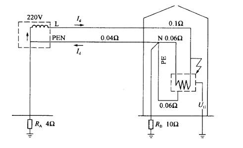 某建筑物釆用TN-C-S系统供电,建筑物地下室设有与大地绝缘的防水层。PEN线进户后即分为PE线和N线,并打人工接地极将PE线重复接地。变电所系统接地RA和建筑物重复接地RB阻值分别为4Ω及10Ω。各段线路的电阻值如下图所示,为简化计算可忽略工频条件下的回路导体电抗和变压器电抗。请回答下列问题。