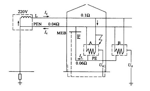 《工业与民用配电设计手册》(第三版)P920、921作总等电位联结内容。短路分析:发生故障后,相保回路电流由相线L(0.1Ω)流经建筑物内PE线(0.06Ω),再流经PEN线(0.04Ω)返回至变压器中性点,全回路电阻和电路电流Id为:R = 0. 1 + 0. 06 + 0. 04 = 0. 2ΩId =220/0.2 = 1100AA设备的接触电压Ut2为碰壳点与MEB之间的电位差,B设备的接触电压Ut3为碰壳点与大地之间的地位差,由于变压器中性点直接接地,大地与变压器中性点等电位,因此B设备外壳接触电压Ut3为:Ut3=Id(RPE+RPEN) = 1100 x (0.06 + 0.04) = 110V