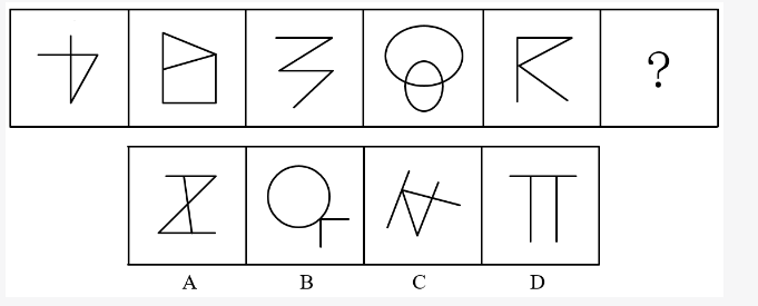 第一步,观察特征。组成元素不同,优先考虑数量类或属性类。图4为一笔画的特征图形,考虑笔画数。第二步,一条式,从左到右找规律。题干所给图形均能一笔画出,所以问号处应选择一笔画图形,只有B项符合。