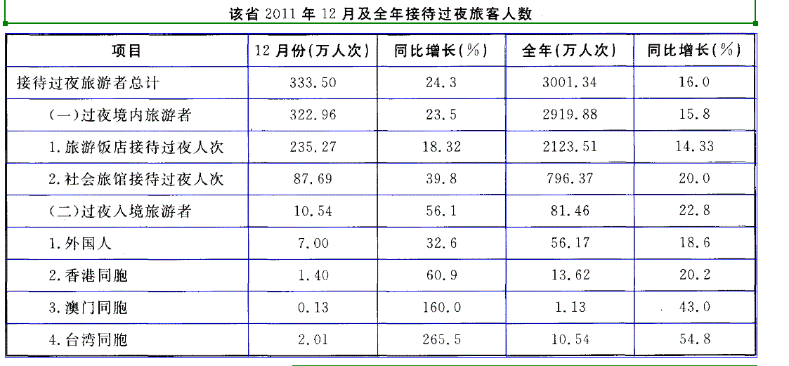 2011年某省接待过夜游客总量再次实现突破,达到3001. 34万人次,同比增长16. 0%。 实现旅游收人324. 04亿元,同比增长25. 8%。12月份宾馆平均开房率为74. 02%,同比增长 0.06%;全年累计宾馆平均开房率为62. 37%,同比增长2.0%。