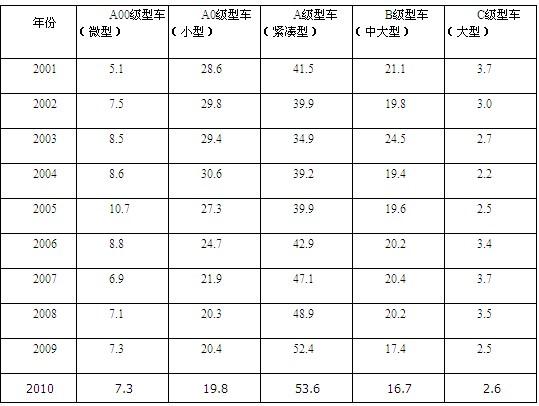 各级别轿车历年销售份额(%)