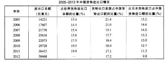 (1),观察表格最后一列数据,从日本货物进口额占货物进口总额的比重逐年递减,正确;(2),观察表格倒数第2列数据,2011年中国对美国的货物出口额占比为17.1%,2005年为21.4%,降低了21.4%-17.1%=4.3%,正确;[img]/upload/tiku/378/4271259_1.jpg[/img]