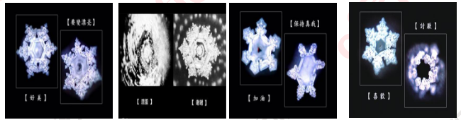 2.展示一个日本作家曾经做过的实验:《水知道答案》,他经过十年的研究实验发现,水是可以记录身边的环境变化以及人的情绪的变化,并根据这些变化会形成不同形状的水晶体。如看到“谢谢”“美丽”等词语的水结晶非常清晰地呈现出美丽的六角形;看到“混蛋”或者“烦死了”的水结晶破碎而零散。简而言之,作者认为只要水感受到了美好与善良的感情时,水结晶就显得十分美丽;当感受到丑恶与负面的情感时,水结晶就显得不规则且丑陋。