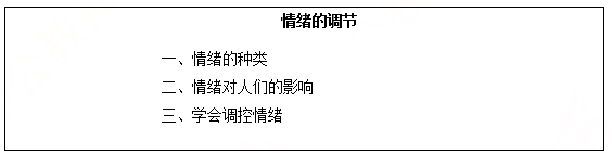 小结:根据本框的内容特点及学生学习的特点,我会结合板书内容,采用归纳式小结。总结情绪的种类以及不同情绪对人们的影响还有学会如何调控情绪。
