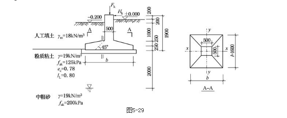 某门式刚架单层厂房基础,采用的是独立基础。混凝土短柱截面尺寸为500mm×500mm;与水平力作用方向垂直的基础底边长l=1.6m。相应于荷载效应标准组合时,作用于短柱顶面上的竖向荷载为Fk,水平荷载为Hk。已知基础采用C30混凝土,基础底面以上土与基础的加权平均容重为20kN/m3,其他参数均如图5-29中所示。