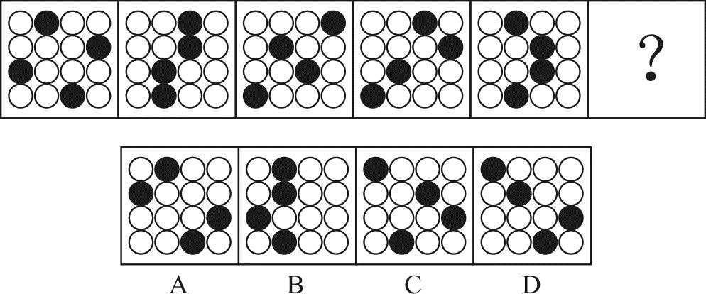 本题图形元素组成相同,都是由4个黑圈和12个白圈组成,考查位置规律。第一段,第一行黑圈每次向右移动一格,第二行黑圈每次向左移动一格,第三行黑圈每次向右移动一格,第四行黑圈每次向左移动一格。第二段,第一行和第二行黑圈每次向左移动一格,第三行和第四行黑圈每次向右移动一格,问号处图形应符合此移动规律,D项正确,当选。故本题的正确答案为D项。