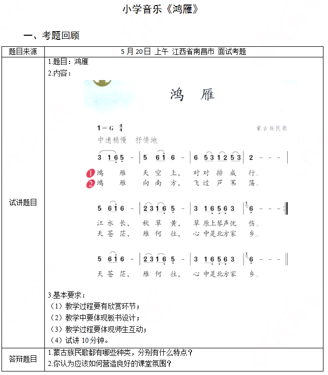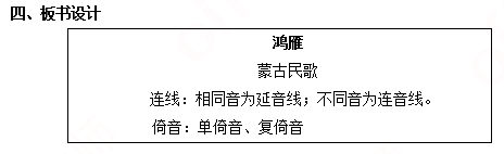 二、考题解析【教学过程】(一)情境导入1.教师设置情境教学,利用多媒体播放关于蒙古族的图片,提问学生图片上是哪个民族?2.教师根据学生的回答总结,并追问对蒙古族又有哪些了解,学生回答后,顺势引入新课。(二)感知歌曲1.播放歌曲,引导学生听的同时,体会歌曲的情绪和速度。(三)探究欣赏歌曲1.教师利用多媒体播放歌曲引导学生说说歌曲的旋律有什么特点?学生回答后总结这首歌的乐句规整,旋律走向呈波浪状,表现了歌曲的宽广,悠扬。2.教师带领同学视读乐谱,回顾曲子中的连音线有什么作用?学生回答后总结连线可以是乐曲更加连贯,继而追问歌曲中出现的倚音又有什么样的作用,可以使歌曲更加悠扬婉转,体现出蒙古族民歌的特色。3..教师用钢琴弹奏歌曲旋律,带学生轻声哼唱,在唱的过程中提醒学生注音歌曲中出现的连线和倚音。4.利用多媒体播放音乐,学生可以跟唱,让学生思考歌曲表达了什么情感?学生回答后教师进行鼓励性的评价并总结,这首歌曲表达了浓浓的思乡之情。(四)巩固提升1.教师引导学生为歌曲创编舞蹈动作。2.小组展示,互评。(五)小结作业1.师生共同总结本节课的收获,引入了解蒙古族的音乐,并要在生活中了解多元化音乐。2.作业:搜集一些其他的蒙古族的民歌,下节课分享交流。