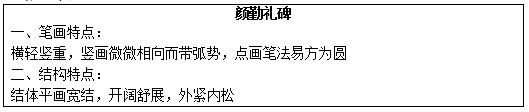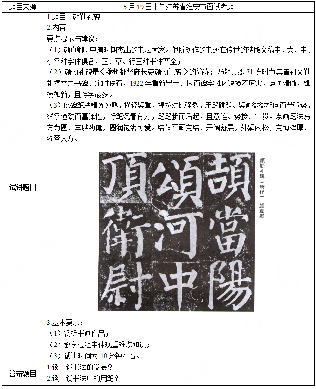 二、考题解析【教学过程】活动一:激趣导入游戏导入,教师提问:“书法大师有哪些?”请同学跟着这种节奏以文字接龙的形式来做答:“王羲之、柳公权、赵孟頫、颜真卿……”教师引导学生关注颜真卿,说说他的作品。题目来源于考生回忆学生交流回答,揭示课题:颜勤礼碑。活动二:直观感知教师提出问题:颜勤礼碑是颜真卿什么时候的作品?作品的主要内容是什么?学生浏览教材并回答:颜勤礼碑是《夔州都督府长吏颜勤礼碑》的简称;乃颜真卿71岁时为其曾祖父勤礼撰文并书碑。活动三:形式分析1.教师出示颜勤礼碑图片,引导学生观察并提问:此碑帖是什么字体?你是怎么判断的?学生回答:楷书,横平竖直,结构方正。2.引导学生观察作品中笔画、结构,追问:颜勤礼碑的书法特点是怎样的?学生回答,教师总结:在笔画方面,横轻竖重,提按对比强烈,竖画微微相向而带弧势,点画笔法易方为圆,丰腴劲健,圆润饱满可爱。结构方面,结体平画宽结,开阔舒展,外紧内松,宽博浑厚,雍容大方。活动四:总结领悟教师引导学生尝试总结楷书欣赏的角度,并组织学生前后四人一组进行讨论,最后师生共同总结:从笔画、结构、用笔、章法等方面进行欣赏。活动五:对比欣赏教师讲述颜真卿和柳公权并称“颜筋柳骨”,出示柳公权的书法作品图片,引导学生根据之前的分组,对比观察:颜真卿、柳公权的书法有哪些不同之处?可以从不同的角度进行对比。学生回答,教师总结:颜真卿横轻竖重,竖画微微相向而带弧势,柳公权书法画画匀衡瘦硬。颜真卿结体平画宽结,柳公权书法结构严谨、一丝不苟。即颜书厚实,柳书瘦劲。教师总结补充,反馈学生的回答。活动六:小结作业师生共同总结本课的重点内容,提示学生中国书法博大精深,各书体有不同的形式特点,希望大家多观察多欣赏多总结,并留作业搜集其他著名书体的作品下节课分享。【板书设计】