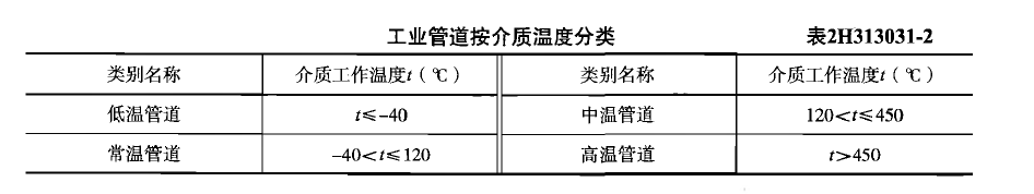 新教材P68页 工业管道按介质温度分类表2H313031-2中:常温管道-40℃<t≤120℃;