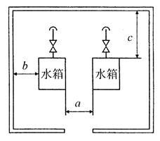 根据《建筑给水排水设计规范》(GB50015—2003)规定,水箱与水箱之间,水箱和墙面之间的净距,均不宜小于0.7m,有管道的一侧,净距不宜小于1.0m。