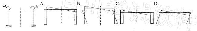 左图所示对称刚架受同向结点力偶作用,弯矩图的正确形状是右侧四个图中的: