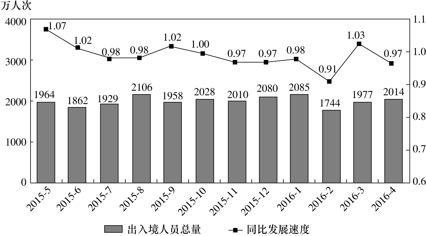 2016年1季度,经S市口岸出入境总人次数为2085+1744+1977=5806(万人次)2015年四季度为2028+2010+2080=6118(万人次),故增长率为