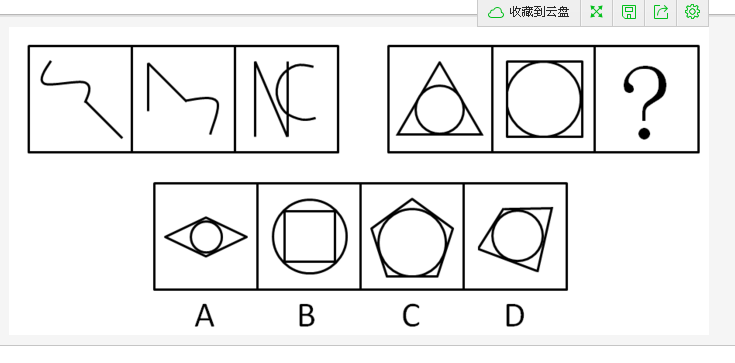 解析1:本题考察数曲线和直线的总数。已知图形第一组图形曲线和直线的总数分别为2、3、4,第二组图形前两个图形曲线和直线的总数分别为4、5,因此第三个图形曲线和直线的总数应该为6。通过分析,A、B、C和D四个选项中图形曲线和直线的总数分别为5、5、6和5,因此只有C项中图形符合。故正确答案为C。 解析2:也可以只数直线,那么两组直线数为1、2、3、3、4、(5)才对,选项分别为4、4、5、4。故正确答案为C。