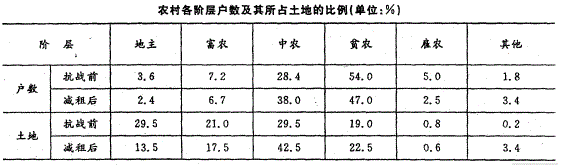 减租减息是中国共产党在抗日战争时期解决农民问题的基本政策。减租又称二五減租,即规定地主的地租一律照原租额减收25%,地租的最高额不得超过37.5%。减息的原则是“分半减息”,规定放贷的年利率最高不得超过10%。下表系1942年至1944年对北岳、太行等五个抗曰根据地调查的数据。