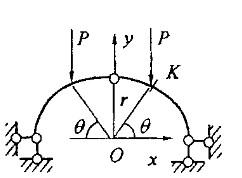图示半圆弧三铰拱,θ=60°,截面K的弯矩为:
