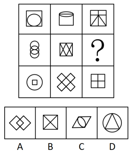 本题属于图形属性类题目。九宫格题目,优先横向观察规律。第一行,均为含有一条对称轴的图形,且该对称轴为竖轴;第二行,前两个图形均为含有两条对称轴的图形,且一条为横轴,一条为竖轴;第三行,均为含有四条对称轴的图形,且一条为横轴,一条为竖轴,一条为左斜轴,一条为右斜轴。遵循此规律,问号处应填入一个含有两条对称轴,且对称轴为一横一竖的图形。A选项符合,当选。因此,选择A选项。