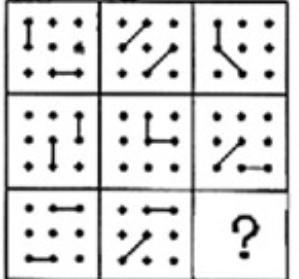 解题指导: 先考虑每个图形两个线段所成角度,每行都有一个平行,一个直角,一个135°。由此可知在BD中选择。每行都有一个图形中的两个线段相接。故答案为B。