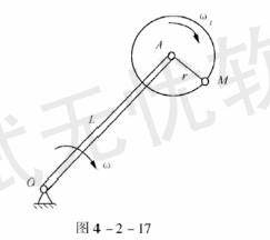 长L的直杆OA,以角速度ω绕O轴转动,杆的A端铰接一个半径为r的圆盘,圆盘相对于直杆以角速度ω绕A轴转动,如图4-2-17所示。今以圆盘边缘上的一点M为动...