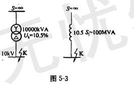 某变电所由系统电源降压,简化接线如图5-3所示。 K点I"为( )。 A.0.56kA; B.5.24kA; C.0.54kA; D.0.62kA。