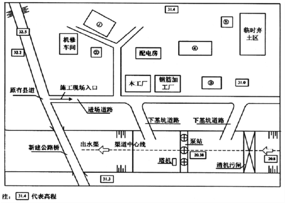 事件2:施工现场地面高程为31.0m-31.4m,泵站底板建基面高程为20.38m,钻探资料表明,地基18.5m-31.4m 高程范围内为黏土,12.0m-18.5m 高程范围内为中砂,该砂层地下水具有承压性,承压水位为29.5m。承包人在施工进水方案中提出,基坑开挖时需要采取降水措施,降水方案有管井降水和轻型井点降水两个方案。事件3:根据施工需要,本工程主要采用泵送混凝土施工,现场布置有混凝土拌合系统、钢筋加工厂、木工厂,预制构件厂、油料库等临时设施,其平面布置示意图如下。