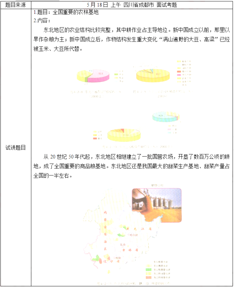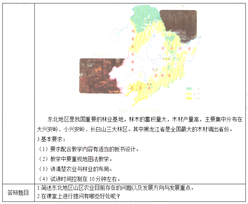 二、考题解析【教学过程】(一)视频导入,引出新课环节一:导入新课温故知新导入,回顾上节课所讲的东北地区土地资源丰富,农林业相对发达,提问学生,东北的土地资源有什么特点,进而提问东北的农业与林业种植有什么特点,进而引入本课。环节二:新课讲授(一)农业基地【展示材料】教师在PPT中展示建国前后东北地区农业生产作物的照片。【提问】(1)东北地区的农业生产以什么业为主?(2)建国前后农作物的种植是否发生了变化,原因是什么?【学生活动】学生看图分析,思考交流。【师生总结】东北地区的农业生产以耕作业为主,建国之前主要是旱作杂粮,建国后结构更加合理主要是玉米、大豆。1.结构完整、耕作业为主【展示材料】教师PPT展示“东北三省农业产值结构”“东北三省农业种植面积构成”“东北三省粮食产量构成”图。【提问】(1)为什么说东北三省的农业结构比较完整?(2)分析东北三省农业种植面积构成的特点。(3)分析东北三省的粮食产量构成的特点。【师生互动】读图思考,教师提问。【师生总结】(1)东北三省的农业产值中,农业占主导地位,占一半以上;其次是牧业,占32.9%;渔业占8.9%,林业占2.3%,所以东北三省的农业结构比较完整。(2)东北三省农业种植面积构成中,以粮食作物最大,其次分别为油料作物和蔬菜作物。(3)粮食产量构成中,谷物占绝对优势,其次是豆类和薯类。谷物类中,玉米比重高达65.76%,其次为稻谷、小麦。2.重要的商品粮基地【展示材料】PPT展示“东北地区商品粮、糖、油、棉基地县分布”图。【提问】(1)东北地区主要粮食作物有哪些?商品粮基地主要分布在哪里?(2)东北地区的主要糖料作物是什么?商品糖基地主要分布在哪些省内?(3)东北地区商品粮油基地主要分布在哪里?【师生活动】学生读图,教师引导总结。(二)林业基地【展示材料】教师PPT展示“东北地区林地分布”图,结合教材内容思考。【提问】(1)东北地区的林木有哪些特点?主要集中分布在哪里?东北地区有哪三大林区?(2)针叶林、阔叶林主要分布在哪些区域?体现了自然带分布的什么规律?(3)经济林主要分布在哪些区域?【师生总结】(1)林木蓄积量大,木材产量高,主要集中分布在大兴安岭、小兴安岭、长白山三大林区。(2)针叶林主要在大兴安岭北部山地,阔叶林主要分布在松嫩平原以东,松辽平原以北广大山地。体现了从赤道向两极的纬度地带性分布规律。(3)经济林主要是在辽东半岛以及辽河平原。环节三:巩固拓展解决课前悬疑:东北地区农林业发达的原因是什么?跟土地资源有什么关系?环节四:小结作业小结:师生共同总结本节课内容。作业:课后搜集东北地区农林业在建国之后的发展历程,了解东北地区的农业发展,为后续学习做铺垫。【板书设计】[img]/upload/tiku/397/10752874_1.png[/img]【答辩题目解析】1.简述东北地区山区农业目前存在的问题以及发展方向与发展重点。【参考答案】(1)存在问题:采育失调,以采伐为主;毁林开荒,森林火灾。(2)发展方向:以森林资源为保育的核心,在抓好“天然林保护工程”的同时,多元开发特色农业产品,在半山区实现“立体开发”,在山区发展特色农业和特色产品配套加工工业。(3)发展重点:林木,人参,养鹿,林蛙等特色经济作物实现由原料型向原料及产品加工并举的转变。2.在课堂上进行提问有哪些好处呢?【参考答案】问题,是激发学生思维的火花,“思维永远由问题开始”。首先独具匠心的设问是成功点拨学生思维、培养学生优良思维品质的极为重要的方式和手段。其次可以起到激发学生学习兴趣,引发求知欲,启迪学生思维,发展学生的智力水平的作用。最后可以活跃课堂气氛,增进师生交流,建立和谐课堂氛围,提高教与学的作用。