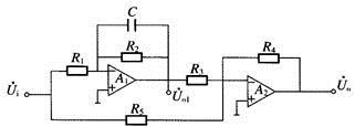 电路如题图所示,已知R1=R2,R3=R4=R5,且运放的性能均理想,的表达式为?( )