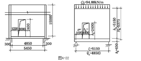 已知柱间基础上的承重墙体高15m,双面抹灰、墙厚240mm,采用Mu10烧结普通砖,M5混合砂浆砌筑,墙上门洞尺寸如图4-22所示,柱间距6m,基础梁长5.45m,基础梁断面尺寸为b×hb=240mm×450mm,伸入支座0.3m;混凝土为C30,纵筋为HRB335,箍筋为HPB235。