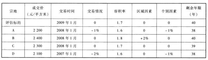 <P>有一待估宗地,剩余使用年限为40年,还原利率为6%,现收集到A、B、C、D四宗土地交易实例,具体情况见下表。表中的交易情况、区域因素和个别因素都是参照物与评估标的相比较,以评估标的为基准确定的数值。该城市此类用地容积率与地价的关系为:当容积率在1.5—2之间时,容积率每增加0.1,宗地地价比容积率为1.5时增加2%。该城市2005-2009年,每年地价指数上升1%。</P><P>