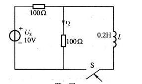 根据换路定则可知,换路瞬间电感的电流不能突变,开关S闭合后电感支路相当于断路,因此iL(0+)=iL(0-)=0,i2(0+)=10/(100+100)=0.05A。