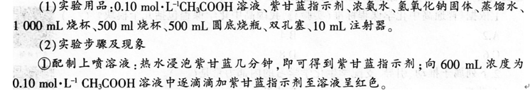 (1)原理: 浓氨水在碱性条件下加热生成氨气.胶头滴管中蒸馏水挤入烧瓶,氨气极易溶于水形成碱性的溶液使紫甘蓝指示剂显绿色.氨气溶于水使压力减小,乙酸溶液进入烧瓶发生中和反应,指示剂恢复紫色,乙酸溶液继续进入烧瓶使指示剂显红色.最终由于碱过量,因而溶液成为绿色。 (2)优点: 首先.在实验中涉及到了氨气的溶解性、压力变化、制取氨气的原理、指示剂的显色、中和反应等学科知识,这是将化学知识融入实验.结合其它学科知识创设情境教学的好方法。 其次.在实验中,学生可以学习和练习更多实验技能,提高动手操作能力。 再次.在实验中要想达到良好的实现效果.需要考虑到化学药品的用量等问题,学生从中学习到有关实验设计的方法.考虑问题更加全面。 最后.色彩鲜明的实验现象容易引起学生的学习兴趣,提高学生学习化学的积极性。