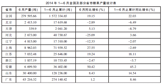 2014 年 1—6 月全国及部分省市糖果产量统计表 2014 年 6 月
