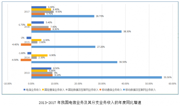 2017年,我国电信业务收入12620亿元,比上年增长6.4%,增速同比提高1个百分点。其中,2017年全年固定通信业务收入完成3549亿元,比上年增长8.4%,在电信业务收入中占比为28.1%,2017年,在固定通信业务中固定数据及互联网业务收入达到1971亿元,比上年增长9.5%,拉动电信业务收入增长1.4个百分点,对全行业业务收入增长贡献率达21.9%。2017年全年移动通信业务实现收入9071亿元,比上年增长5.7%,在电信业务收入中占比为71.9%。2017年,在移动通信业务中移动数据及互联网业务收入5489亿元,比上年增长26.7%,对收入增长贡献率达152.1%。
