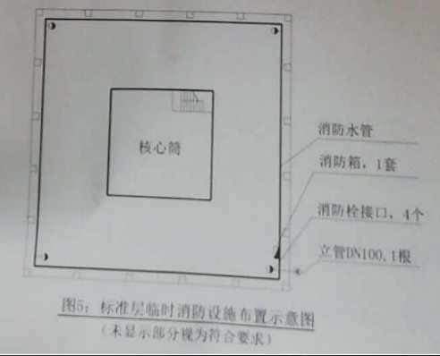 背景资料一新建工程,地下二层,地上二十层高度70m,建筑面积40000m2,标准层平面为40m×40m。项目部根据施工条件和需求,按照施工机械设备选择的经济性等原则,采用单位工程量成本比较法选择确定了塔吊型号。施工总承包单位根据项目部制定的安全技术措施.安全评价等安全管理内容提取了项目安全生产费用。施工中,项目部技术负责人组织编写了项目检测试验计划,内容包括试验项目名称.计划试验时间等,报项目经理审批同意后实施。项目部在\"X工程施工组织设计”中制定了临边作业.攀登与悬空作业等高处作业项目安全技术措施。在“绿色施工专项方案”的节能与能源利用中,分别设定了生产等用电项的控制指标,规定了包括分区计量等定期管理要求,制定了指标控制预防与纠正措施。在一次塔吊起吊荷载达到其额定起重星95%的起吊作业中,安全人员让操作人员先将重物吊起离地面15cm然后对重物的平稳性,设备和绑扎等各项内容进行了检查,确认安全后同意其继续起吊作业。“在建工程施工防火技术方案”中,对已完成结构施工楼层的消防设施平面布置设计见图5。图中立管设计参数为:消防用水量15L/s,水流速ⅰ=1.5m/S;消防箱包括消防水枪.水带与软管。监理工程师按照《建筑工程施工现场消防安全技术规范》GB50720-2011)提出了整改要求。