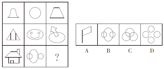 第一行图形的封闭区域数都是1,第二行都是3,第三行都是4,故本题选D。