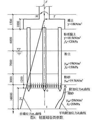 某一桩基传至柱底(标高-0.5m处)长期效应组合的荷载值为F=9000kN,M=1800kN·m,H=800kN,其它数根据如图4所示,建筑安全等级为一级,采用桩径为500mm×500mm的混凝土预制桩,试按《建筑桩基技术规范》(JGJ 94—2008)规定的方法计算该桩基础的沉降量。桩基的最终沉降量计算结果与下列( )mm接近。