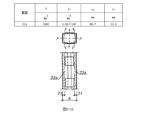 某钢结构平台,由于使用中增加荷载,需增设一格构柱,柱高6m,两端铰接,轴心压力设计值为1000kN,钢材采用Q235钢,焊条采用E43型,截面无削弱,格构柱如图3-18所示。提示:所有板厚均≤16mm。