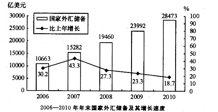 从图表可以直观地看到,2006-2010年国家外汇储备额逐年递增,故A项正确。B、C项由题中数据均无法推出。D项无法从文中推出,且本身说法不准确,如果国内通胀是由需求引起的,那么人民币升值会对通胀产生抑制作用;如果国内通胀是由投资过热引起,一旦人民币有升值预期,那么国际上的热钱无疑会涌入,结果是加剧通胀。故本题正确答案为A项。