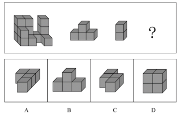 从所给的四个选项中,选择最合适的一个填入问号处,使下图的立体图形①、②、③和④可组成一个完事的长方体: