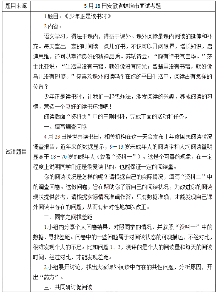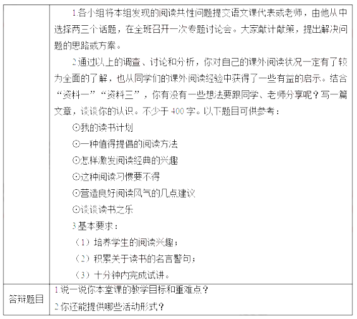 二、考题解析【教学过程】(一)揭示主题首先请同学们观看几幅图片,看看:你认识他们吗?(学生根据图片回答)这些名人、名家跟我们相隔了遥远的时空,可我们见到他们却像见到了老朋友,你是通过什么渠道认识了解他们的?是的,书能引领我们跨越时空的界限,领略古今的风情,使我们“秀才不出门,而知天下事”。因此,我们不仅要好读书,而且要读好书。下面请同学们把课本打开翻到本单元综合性学习,请同学们齐读前言。(板书课题)(二)实践探索环节一:读书名言1.古今中外的思想家、文学家、科学家,写下了大量精彩的读书名言,你知道哪些呢?谁来说说?请同学们汇报自己搜集的情况。看看谁是“搜集小达人”。2.老师这还有一组名言,邀请同学们一起来感受领悟。(指名学生读)书是一扇窗户——高尔基说:“每一本书,都在我面前打开了一扇窗户。”书是良药——汉朝刘向说:“书犹药也,善读之可以医愚。”书是阳光——莎士比亚说:“生活里没有书籍,就好像没有阳光。”3.依照上面的例句,运用相同的修辞方法,写出你对书的认识。同桌之间互相交流一下。书是________——我说:“________________。”环节二:读书经验1.读书也要掌握一些方式方法,名人的读书经验值得我们借鉴,你知道的名人读书经验有哪些?选择其中的一条来推荐给同学们。(学生自由回答)2.老师这里还有一些读书经验送给大家,希望与你们共勉。(齐读)理学家朱熹的“三到法”,读书时要:心到,眼到,口到。大教育家孔子的“学思结合法”——“学而不思则罔,思而不学则殆”。史学家顾炎武的“新旧法”:每年用三个月复习旧知识,其余时间学新书。苏轼说:“读书不厌百回读,熟读精思子自知。”英国弗?奥斯本说:“与其匆匆博览百本,不如彻底消化几本。”希望这些读书经验对你的读书会有所帮助。环节三:读书故事这么多的经验不是他们在一朝一夕中总结出来的,他们是在孜孜不倦地读书中得来的,他们身后有许多感人的故事,请同学们把你知道的名人故事讲给你的小组成员听,其他成员谈感想。推荐四名学生在班里名人读书的故事,其他同学说感受。(三)展示交流这些名人在获取知识的时候,经历了这样多的磨难,但是他们靠着勤奋执着,最终成为人们敬仰的人,同学们对他们渴求知识的精神也给予了充分的肯定。那么在衣食无忧的今天,同学们自己的读书情况又是怎样的呢?1.出示读书调查问卷,分组完成调查报告,小组长汇报调查结果。总结:看来,我们课外阅读的情况不容乐观,我们一起来集思广益,看看如何培养课外阅读兴趣。小组推荐代表发言,培训阅读兴趣教师可引导学生从阅读书籍类别、阅读习惯、阅读方法等方面发表自己的观点。(教师总结)2.辩论:网上阅读利弊组织辩论:21世纪的今天,有了一种更方便的阅读方式——网上阅读,那网上阅读是否真的很好呢?请各小组之间拿出一个意见,一会儿我们正方反方进行辩论。小组派代表进行辩论。总结:网上阅读有利又有弊。的确如此,即便是人也不可能是十全十美的,更何况是网络那虚拟的空间呢?但人是有主观能动性的,只要我们好好把握自己,严于律己,网上阅读将带给你一片广阔的新天地。(四)评价反思大家在刚才的活动中充分发挥了自己的主观能动性,将自己课前搜集的资料展示给其他的同学,不仅丰富了大家的知识,同时也增强了自己的综合能力。通过我们刚才的分享,其实不难发现在信息技术发展的今天,我们阅读的资源更加丰富,阅读方式更加的多元化,而且读书对我们大有益处,我们还有什么理由不读书呢?(五)小结作业小结:师生共同总结。作业:从今天开始,让我们重新规划我们的读书计划,开始我们的读书之旅吧!课下作业是制定一份读书计划。【板书设计】[img]/upload/tiku/397/10752503_1.png[/img]【答辩题目解析】1.说一说你本堂课的教学目标和重难点?【参考答案】根据新课标中“对周围事物有好奇心,能就感兴趣的内容提出问题,结合课内外阅读,共同讨论”这一要求、学生的实际情况和题本给出的基本要求,我确立了本课的教学目标以及教学重难点,其中教学目标为1.知识与能力:积累关于读书的名言警句,了解名人读书的方法和经验。2.过程与方法:通过活动和小组讨论,激发阅读兴趣。3.情感态度与价值观:培养正确的读书观,进一步提升阅读的水平。教学重点是:积累关于读书的名言警句,了解名人读书的方法和经验。教学难点是培养学生正确的读书观,进一步提升阅读的水平。之所以这样设立是语文课堂要保持工具性和人文性的统一,所以学生在学会知识点的同时还需要得到一些情感上的熏陶。以上就是我全部的答案,谢谢考官!2.你还能提供哪些活动形式?【参考答案】(1)举行一次读书问卷调查。(2)在全班举办“读书交流会”。(3)举行“名著走向舞台”话剧表演。(4)举行名著知识竞赛。(5)说一说名人读书名言。(6)“名人读书故事”大家讲。(7)举办关于“读书”的演讲大赛。