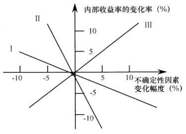 本题考查房地产投资项目的敏感性分析。三条线斜率绝对值的大小代表了项目敏感性的大小。即线越陡敏感性越大,由图观察知,Ⅱ最陡,Ⅰ最平缓,所以按敏感性由大到小的顺序为Ⅱ一Ⅲ一Ⅰ。
