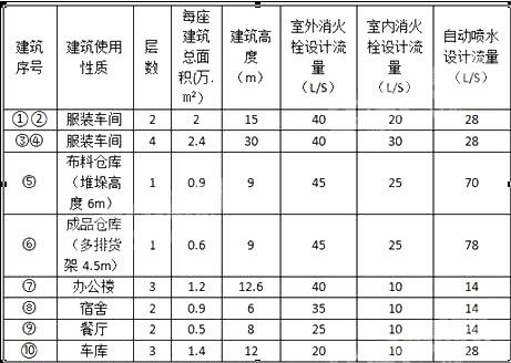 华南滨海城市某占地面积10hm2的工厂,从北向南依次布置10栋建筑,均为钢筋混凝士结构级耐火等级。各建筑及其水灭火系统的工程设计参数见表1
